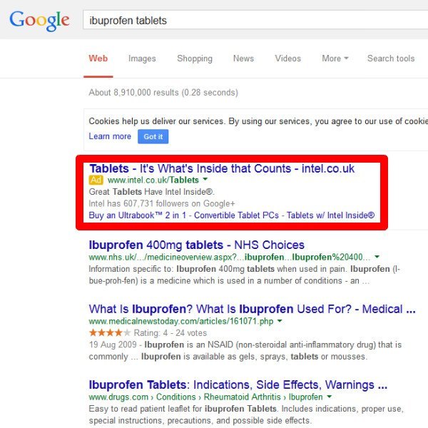 It’s easy to make blunders with unusual synonyms. But Intel doesn’t show up for ‘paracetamol tablets’, so they’ve obviously considered the fact that medicine-related search queries might trigger their ads. Looks like they didn’t dig deep enough into their medical dictionary.