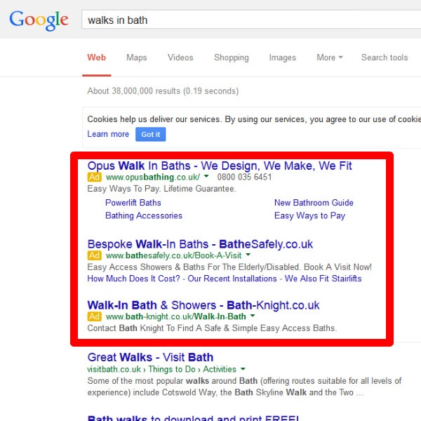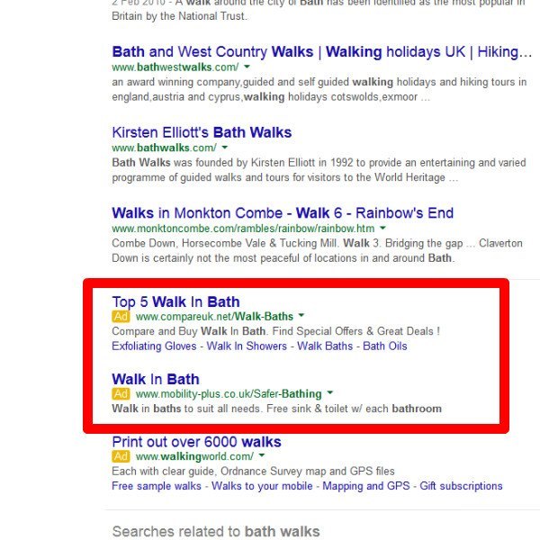It could be argued that some people might accidently type ‘walks in bath’ when they mean ‘walk-in bath’. But the organic results are all about walking routes and related subjects, so it doesn’t look like any SEOs are making the same assumption.