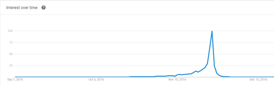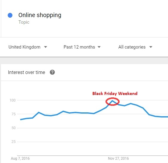 A total of £6.45bn was spent throughout the Black Friday period of Monday 21st – Monday 28th November 2016, making it one of the top-ranking online shopping periods for the entire year. In terms of search volumes Cyber Weekend was number one over the festive period, as you can see from the Google trend screenshot below: