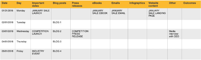 This is where you plan content delivery over the coming weeks, or months. It lets you align content marketing activities for the best impact, and plan ahead for key events and trends.