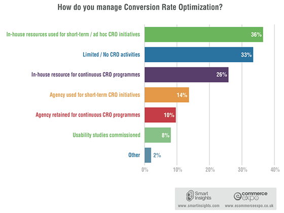 What about the type of CRO? I was looking to see how many businesses managed CRO on a continuous ‘always-on’ basis. Here just 10% used an agency for continuous CRO with 26% using this approach in-house. A sizeable proportion (over one third of businesses) used more ad hoc CRO approaches, again showing opportunities for improving website effectiveness.