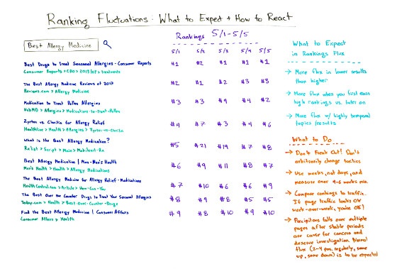 Last week’s Whiteboard Friday saw Rand Fishkin talk us through what to expect and how to react to ranking fluctuations. He explained why ranking fluctuations occur, the importance of keeping your cool during those darker moments, and how to identify when you should actually be concerned. Watch the video here.