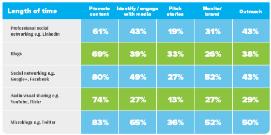 The report also showed that microblogging platforms received the most attention from PRs. In a breakdown of professional tasks by preferred platform, microblogs came out top for promoting content, identifying and engaging with media, pitching stories and outreaching.