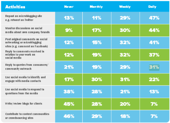 The report reveals that while a majority of PRs believe that social media is about conversation, only 31% use social media to respond to consumer comments and community outreach on a daily basis, while 21% never do so.