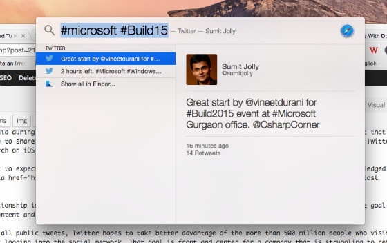 Costolo also revealed that Twitter was in talks with Apple to bring tweets to Spotlight Search. And, lo and behold, BuzzFeed discovered that you could already search by hashtag to bring up tweets. Here’s a screenshot: