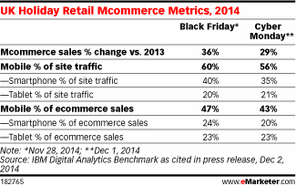 eMarketer also referenced a December 2014 IBM report that showed that UK e-Commerce sales on mobile reached nearly half of total sales for Black Friday (47%) and Cyber Monday (43%).