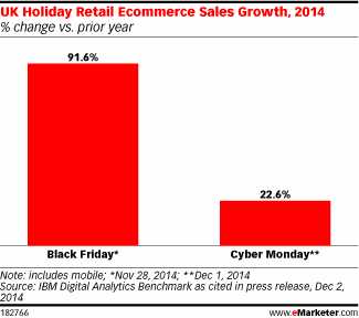 Black Friday's growing influence is also confirmed by IBM's report, which showed Black Friday retail e-Commerce sales grow by an astonishing 91.6% between 2013 and 2014. This dwarfs Cyber Monday's growth, which stood at 22.6% - an impressive figure under any other circumstances.