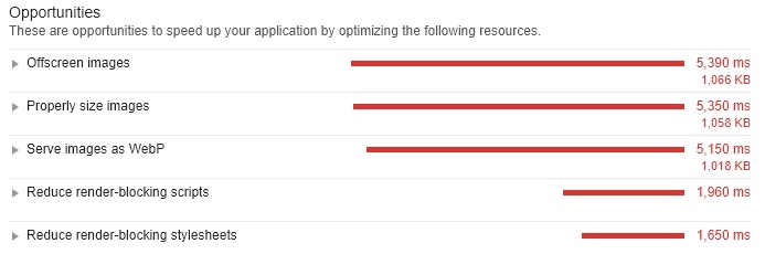 Lighthouse also highlights further significant performance metrics such as image sizes, render-blocking scripts, image optimization, and compression.