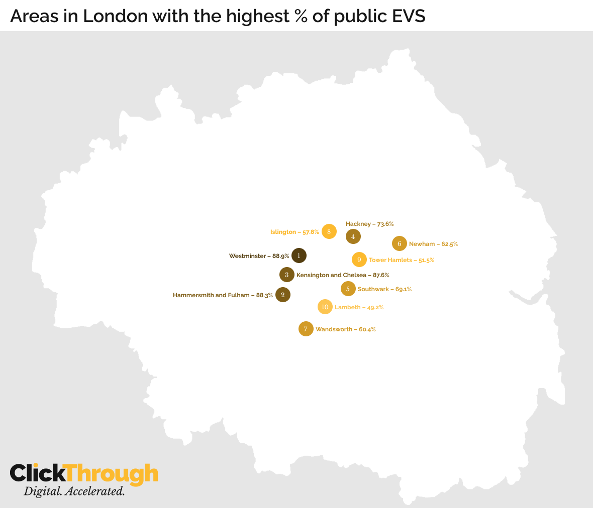 This could be down to greater local investment in greener transport, a response to rising levels of commuters in electric vehicles, or at the request of local businesses. It’s worth noting that fully electric vehicles are exempt from the London congestion charge, so the abundance of EV charge points could also be down to a general push towards electric vehicles in the capital.