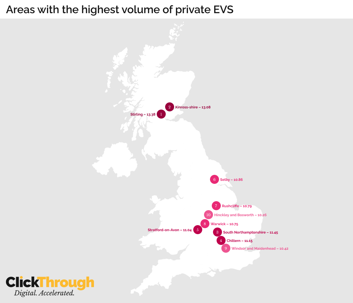 Looking more beyond cities, the areas with the highest volume of private charge points varied across the UK, with Kinross-shire and Stirling in Scotland topping the table. We’ve commented on the number of private charge points as areas with higher volumes will see less strain and demand on public charge points.