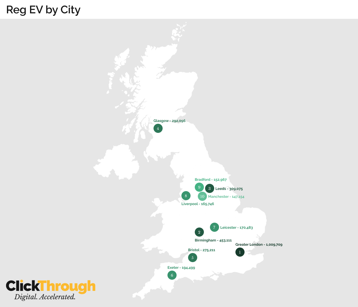 Naturally, London has the most registered electric vehicles by far, with 1,009,709 vehicles registered, sharing 2.78 per 100 EVs. Birmingham follows London with 453,111 vehicles registered, sharing 0nly 0.62 charge points for every 100 vehicles registered.