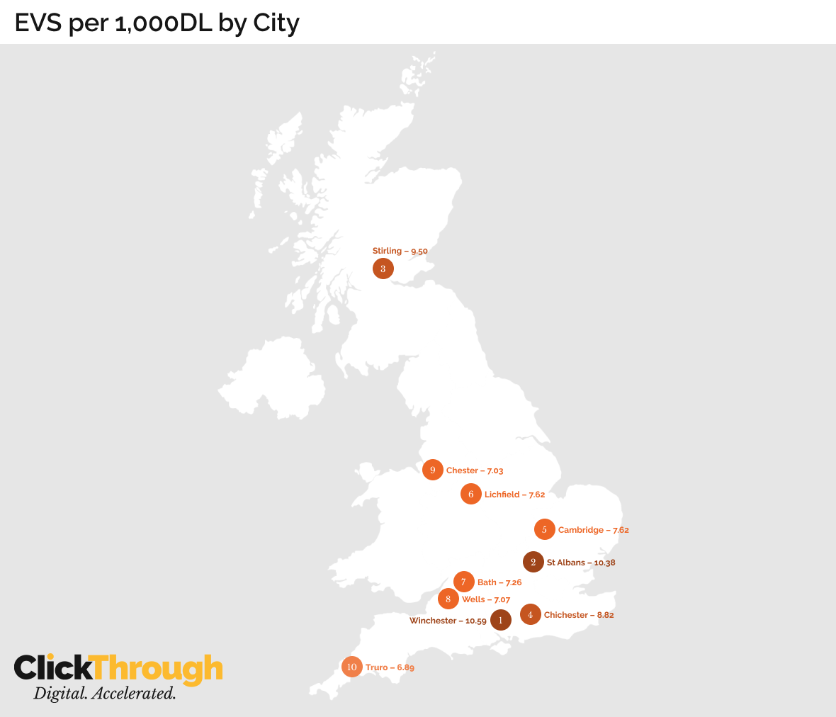 Winchester are also well-prepared, coming in as the top city for charge points per 1,000 driving license holders (10.59 per thousand). However, with a high uptake of electric vehicles in the area already, 55,149 EV drivers are already putting these to good use (sharing 1.28 per 100 electric vehicles).