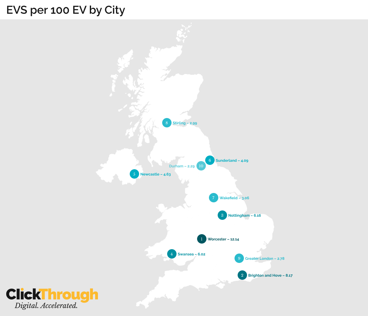 Some cities are well prepared for any potential uptake in electric vehicles, while having a relatively small amount of registered electric vehicles in the area. For example, Worcester rank 35th for total electric vehicles registered (6,393), and 1st for charge points per 100 vehicles, with one between every ten EV drivers.