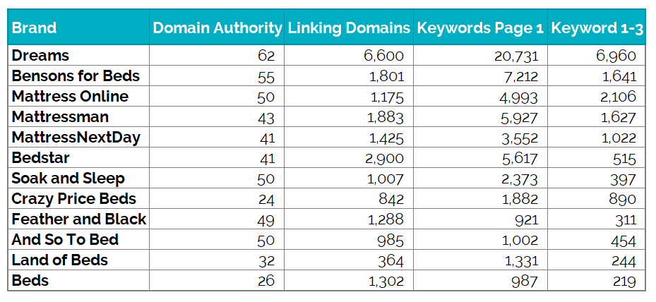 Let’s look at some examples from leading sleep retailers in the industry and how they compare to each other looking at Domain Authority, keyword rankings and website trust.