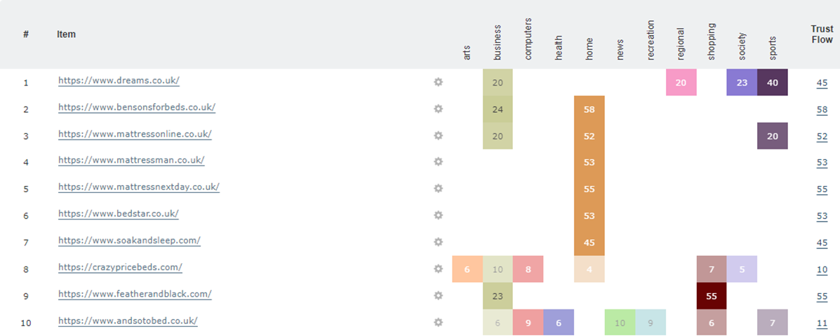 AND SO TO BED, Dreams, and Crazy Price Beds are doing well in broadening out their linking domains across a variety of topics that the linking domains cover. However, Dreams is performing better looking at their trust flow figure. Although AND SO TO BED and Crazy Price Beds are doing well in acquiring links from different topics and sectors, they’re spreading themselves thin. Dreams have done a good job expanding sectors once they’ve gained lots of trust in each one of them. The brands in the middle of the table are doing well in the home market (a very important sector to be in as a bed brand) but have lots of opportunities to expand and compete with the other brands.