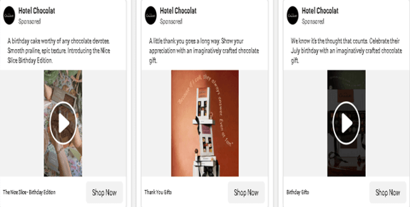 We’ve included screenshots of Hotel Chocolat’s sponsored Facebook posts. This UK chocolate supplier provided unique content with each post, which is a great way to entice their audience to read their social media posts and build traction online.