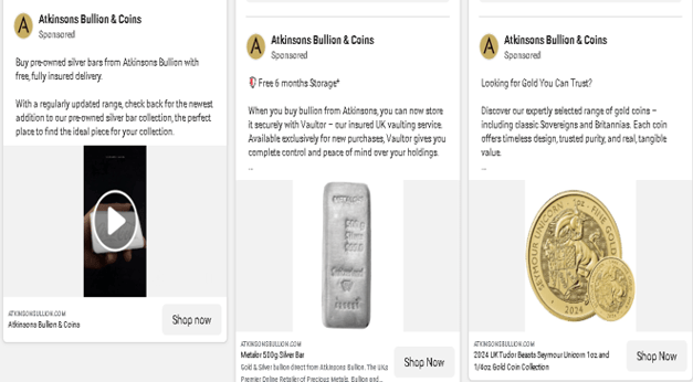We’ve included screenshots of Atkinsons Bullion & Coins’ sponsored Facebook posts. This UK gold bullion dealer included vertical images, suggesting they’re catering to mobile users, though they should reduce the amount of text per post to improve the chances of social media users reading their content.