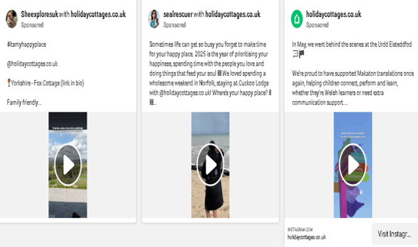 We’ve included screenshots of Holidaycottages.co.uk’s sponsored Facebook posts. This UK holiday cottage should refrain from using large chunks of text per post, as this can discourage a social media follower from reading their content.