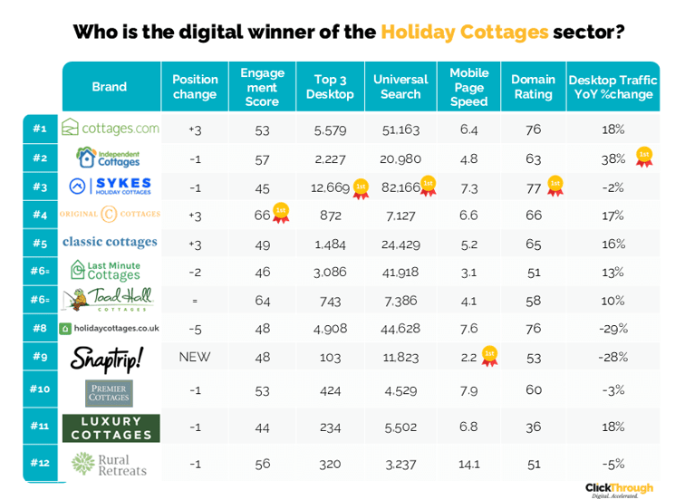 The research gives an inside track on who is winning the biggest share of voice online and quantifies the gaps, risks, and missed opportunities for other UK holiday cottages rentals to win brand exposure, drive traffic online and, for those with bricks and mortar locations, even increase in-store footfall. The report highlights quick wins that will improve enquiries from your online strategy and identifies the barriers that may be reducing your site’s ability to optimise digital performance.