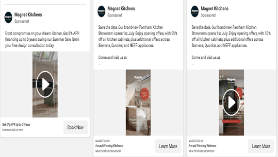 We’ve included screenshots of Magnet’s sponsored Facebook posts. This UK kitchen retailer should vertical media choices, suggesting they’re catering to mobile users.