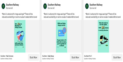 We’ve included screenshots of Southern Railway’s sponsored Facebook posts. This UK train operator included the same text for each post but with a slight variation on their imagery, suggesting they’re testing which image receives the highest engagement.