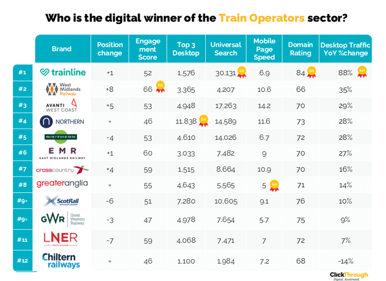 The research gives an inside track on who is winning the biggest share of voice online, and quantifies the gaps, risks, and missed opportunities for other train operators to win brand exposure locally, online views, and ticket orders. The report highlights quick wins that will improve sales from your online strategy and identifies the barriers that may be reducing your site’s ability to optimise digital performance.